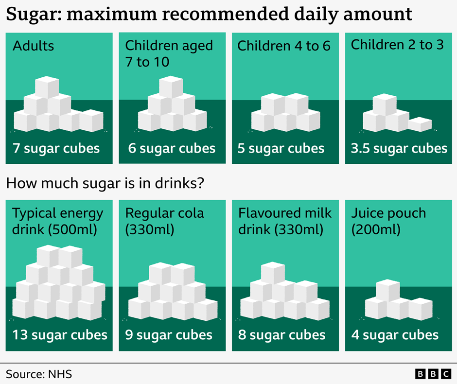 Children aged 7–10 years should have no more than 24g of free sugars per day (about 6 sugar cubes).
